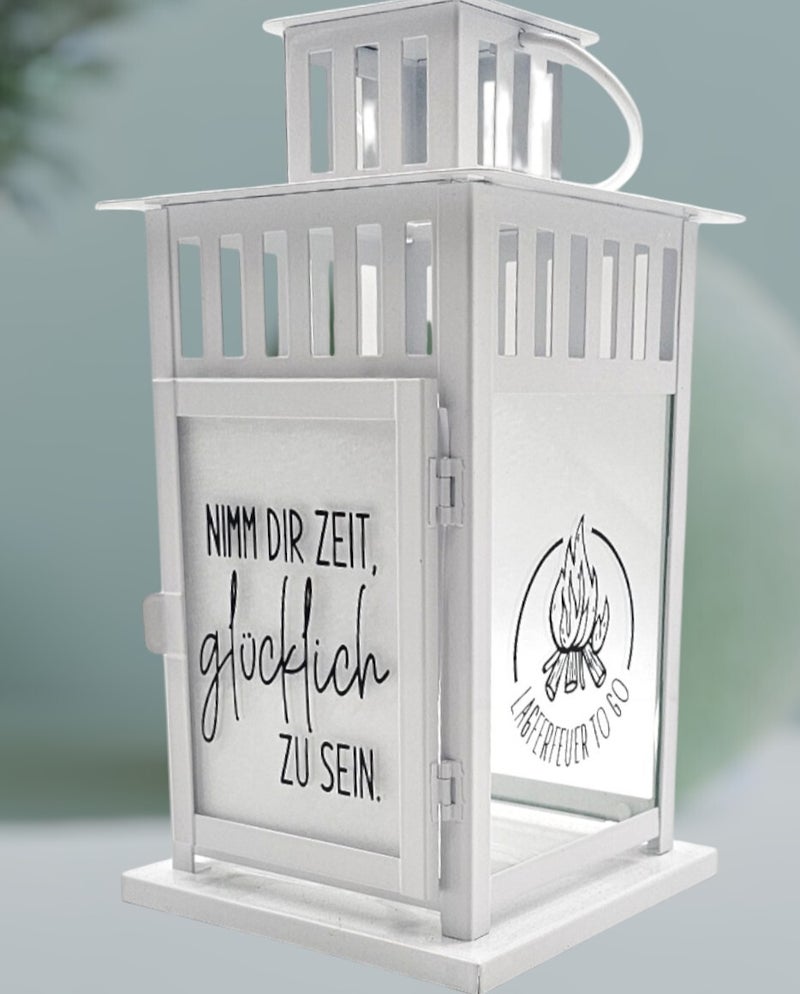 Mit der Laterne „Nimm dir Zeit, glücklich zu sein“ schaffst du dir einen Ort der Ruhe und des Glücks, an dem du einfach mal durchatmen und das Leben genießen kannst.