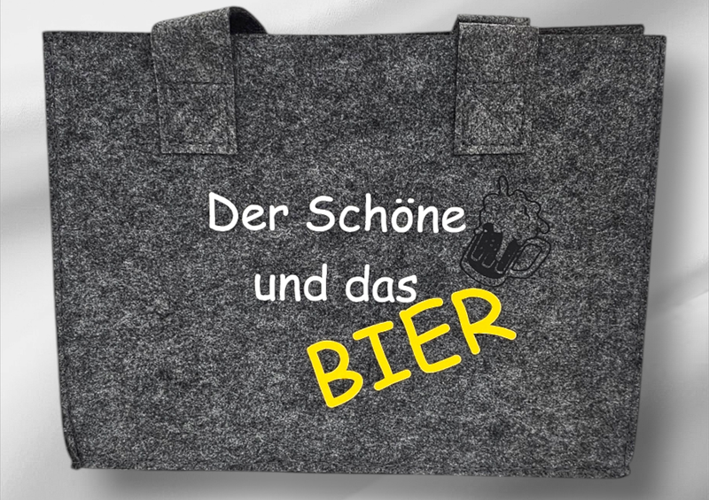 Diese originelle Filztasche ist der perfekte Begleiter für alle, die ihren Sinn für Humor immer bei sich tragen möchten. Mit der humorvollen Aufschrift „Der Schöne und das Bier“ setzt du ein augenzwinkerndes Statement – ideal für Bierliebhaber und alle, die das Leben nicht zu ernst nehmen. Egal, ob für den Einkauf, einen gemütlichen Abend mit Freunden oder den Alltag – diese Tasche vereint Funktionalität mit einem witzigen Touch.