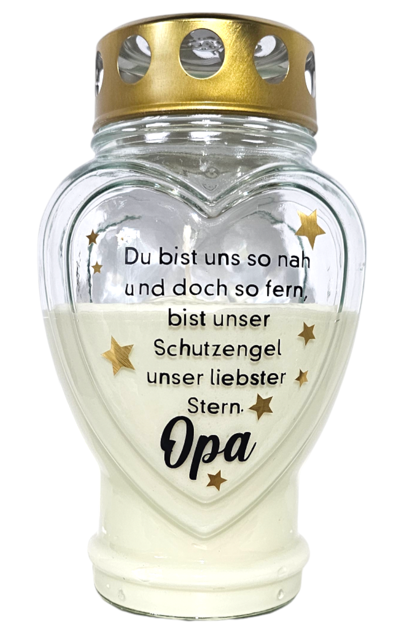 Ein Großvater hinterlässt Spuren der Liebe, Weisheit und Geborgenheit in den Herzen seiner Familie. Die Grabkerze mit der Aufschrift „Opa“ ist ein Zeichen des Respekts und der Dankbarkeit für einen Menschen, der mit seiner Liebe das Leben bereichert hat. Die sanfte Flamme steht für die bleibende Erinnerung an gemeinsame Erlebnisse und wertvolle Momente.