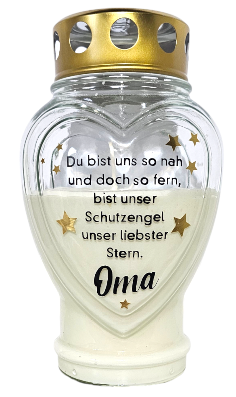 Eine Großmutter ist eine Quelle der Liebe, Wärme und Geborgenheit. Die Grabkerze mit der Aufschrift „Oma“ ist eine würdevolle Möglichkeit, die Erinnerung an eine geliebte Großmutter lebendig zu halten. Sie symbolisiert Dankbarkeit, Liebe und die vielen wertvollen Momente, die für immer im Herzen bleiben.